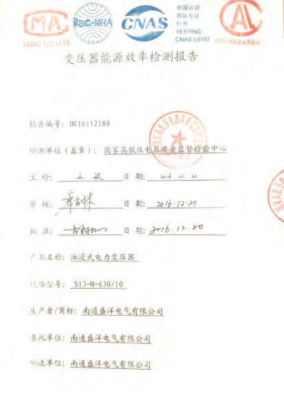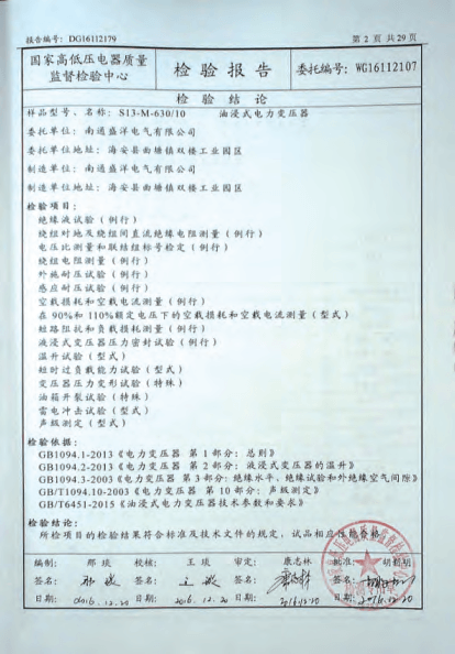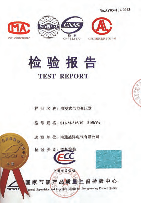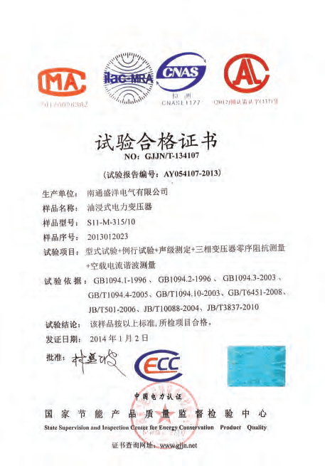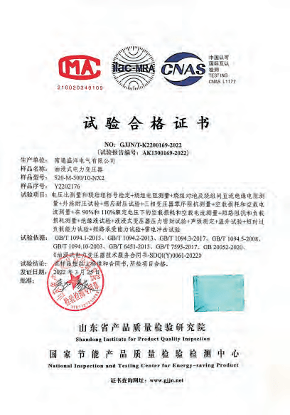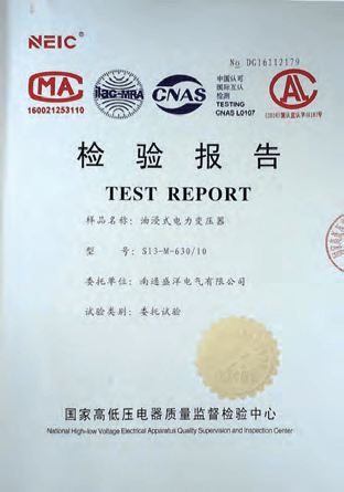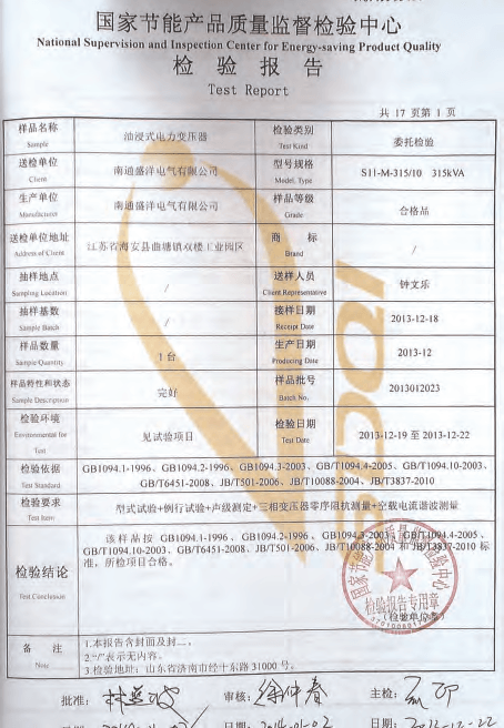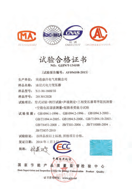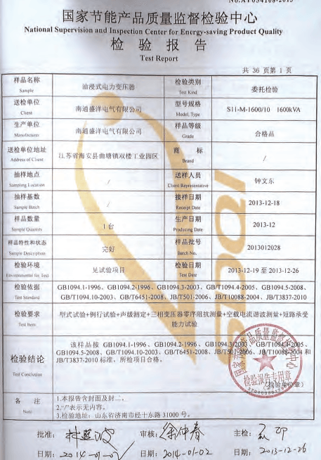 Công ty chúng tôi đã thông qua hệ thống quản lý chất lượng ISO 9001, hệ thống quản lý môi trường ISO14001 và chứng nhận PCCC. Sản phẩm của chúng tôi đáp ứng các tiêu chuẩn quốc gia của Trung Quốc và tiêu chuẩn IEC. Chúng tôi đã nhận được sự chấp thuận của Trung tâm Giám sát và Kiểm tra Chất lượng Máy biến áp Quốc gia. Chúng tôi đã giành được các chứng chỉ danh dự như Doanh nghiệp công nghệ cao và mới Giang Tô và Sản phẩm đáng tin cậy về chất lượng Giang Tô. Mỗi máy biến áp đều trải qua một loạt thử nghiệm trong suốt quá trình sản xuất, ngay từ giai đoạn nguyên liệu thô đến giai đoạn cuối cùng. Tất cả các cuộc kiểm tra định kỳ đều được thực hiện tại nơi làm việc của chúng tôi theo tiêu chuẩn quốc gia của Trung Quốc và các Thông số kỹ thuật quốc tế khác. Các thử nghiệm điển hình về cường độ ngắn mạch chịu xung, v.v., đã được tiến hành trên các thông số đặc trưng và cấp điện áp đại diện, tại các cơ sở thử nghiệm quốc gia được phê duyệt. Chứng chỉ ISO cũng đã được xác nhận lại gần đây. Ngoài ra, công ty chúng tôi luôn chú trọng hơn đến việc củng cố và nâng cao nhận thức về chất lượng của đội ngũ nhân viên, thông qua việc thực hiện quản lý nhân sự thường xuyên và đào tạo kỹ năng chuyên môn, nhằm đảm bảo năng lực quản lý và điều hành thâm nhập vào mọi khía cạnh của ý thức về chất lượng.